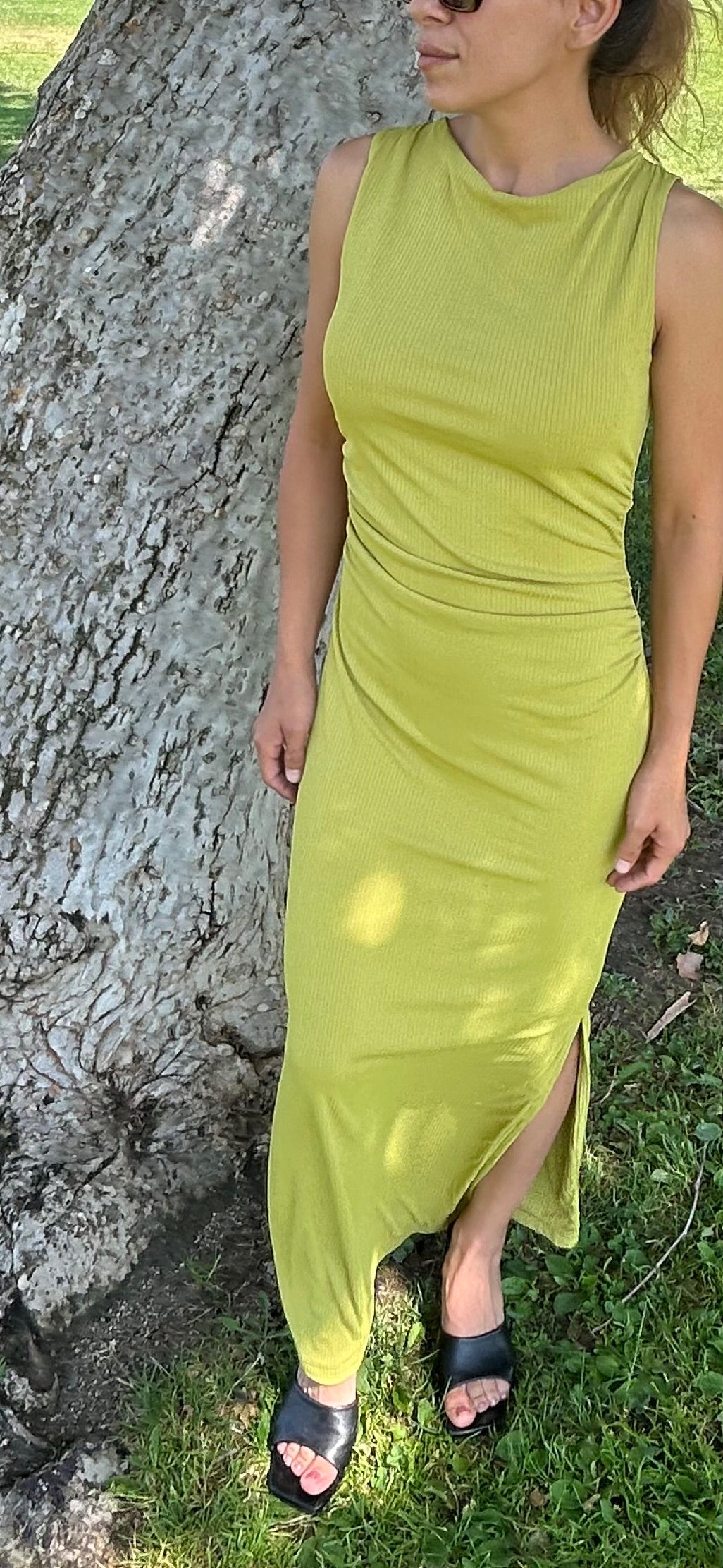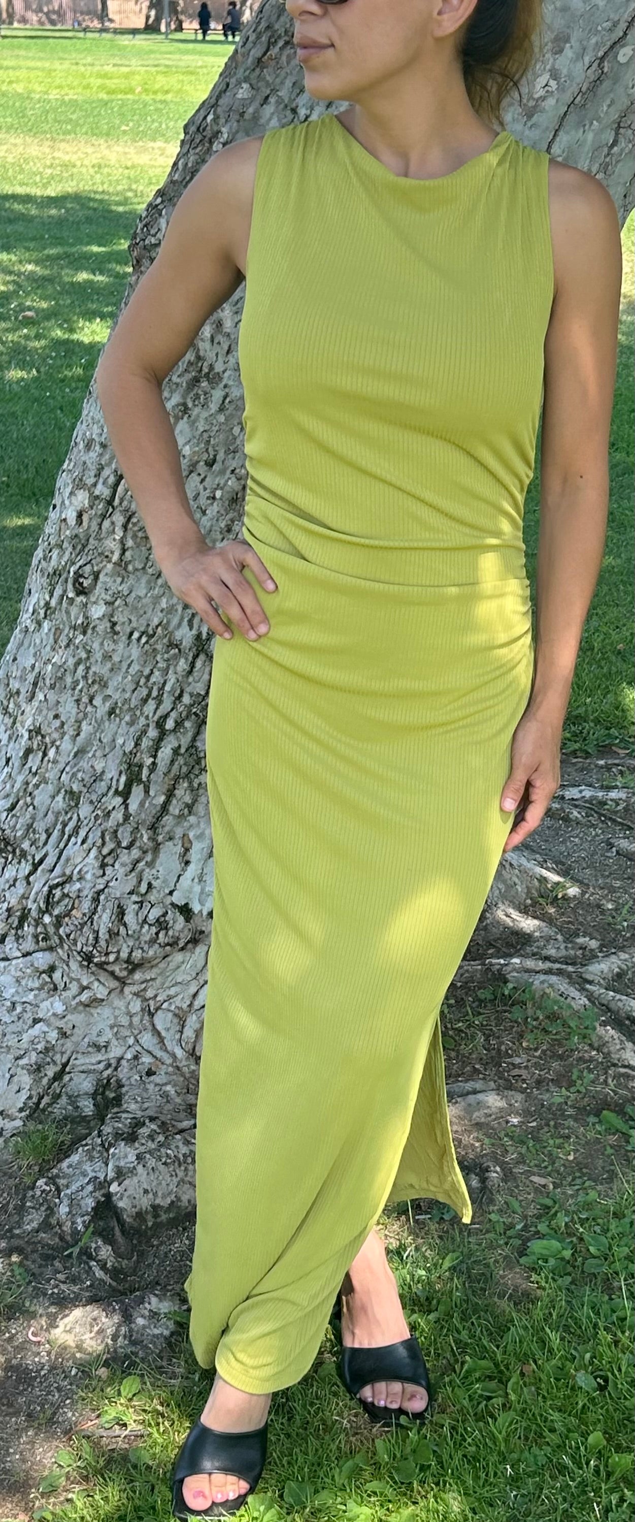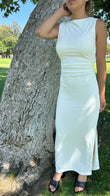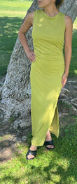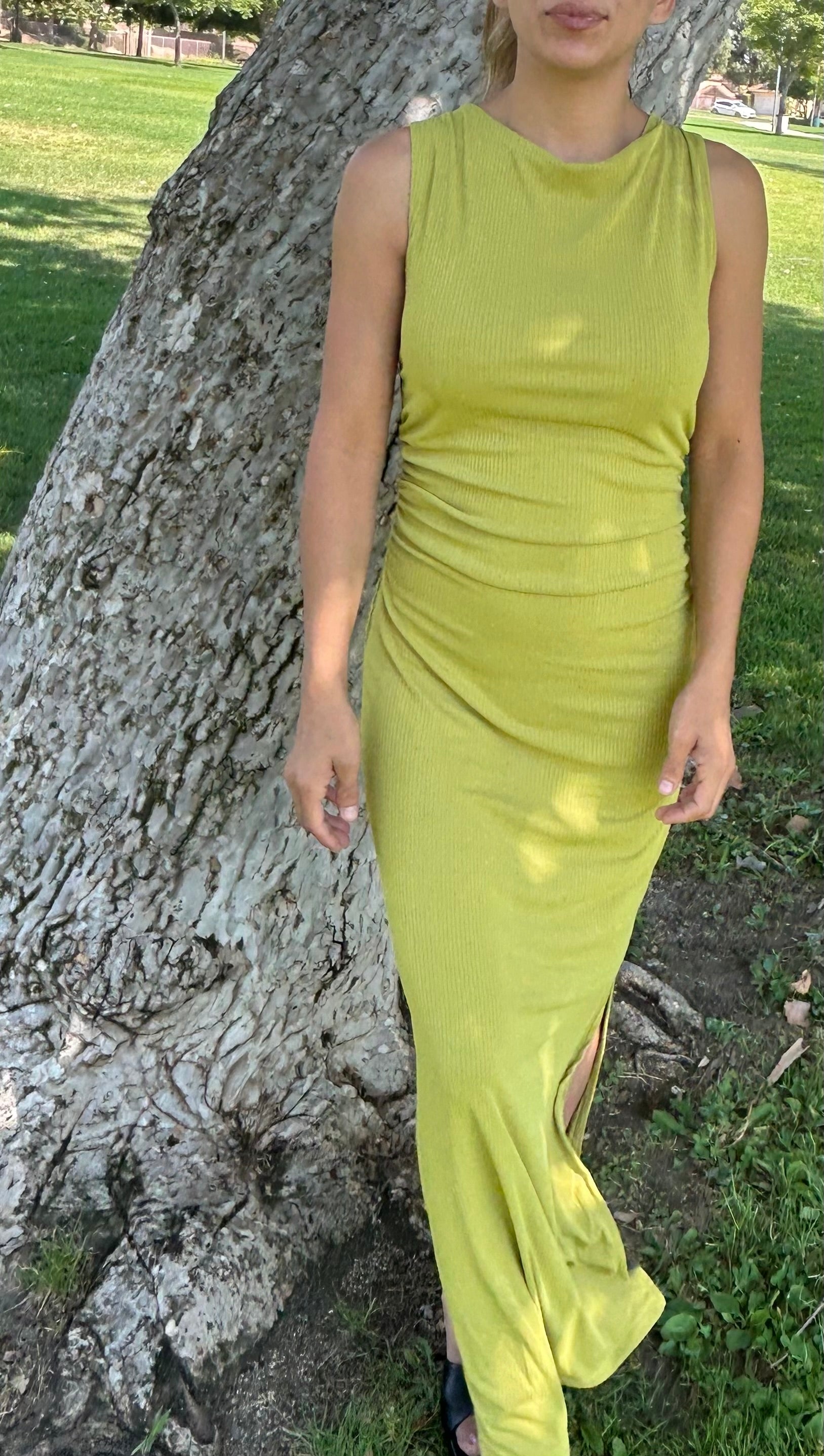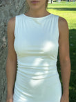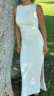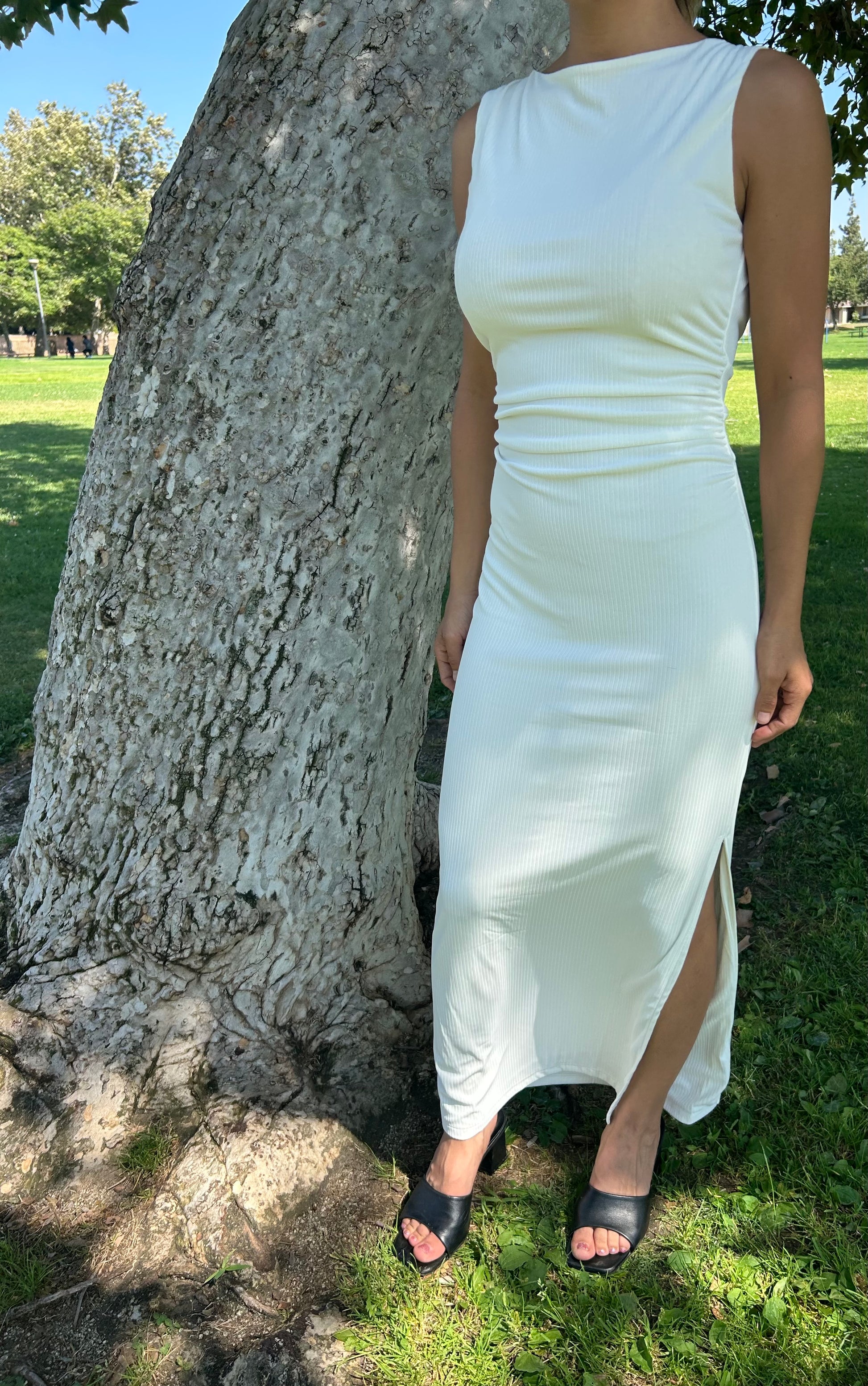 Expertly crafted, the Siona Dress boasts a ribbed design and long silhouette in classic white and olive hues. Its backless feature adds a touch of elegance, making it the perfect dress for any occasion. Stay stylish and comfortable with this versatile and chic dress.